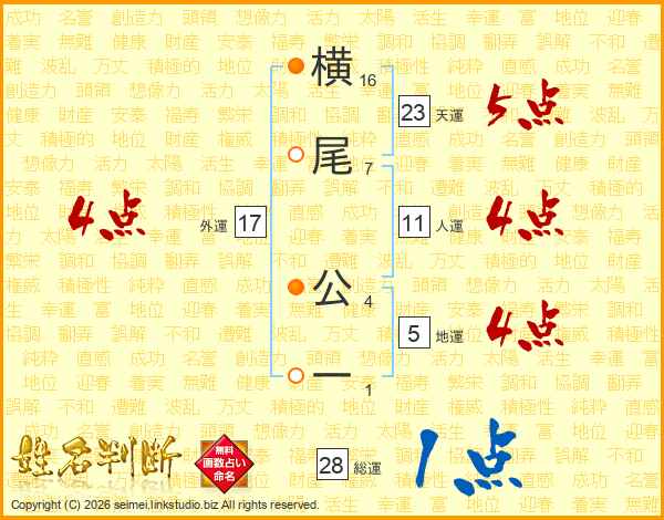 生活面を象徴する運勢です。外部から受ける影響力を表し、結婚運、家庭運や職場、環境への順応性を表します。総運から人運を引いた画数。姓や名が1文字の場合を除く。