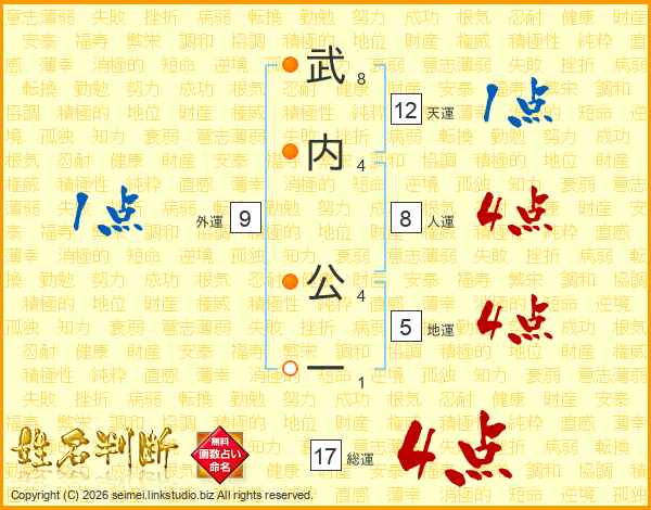 生活面を象徴する運勢です。外部から受ける影響力を表し、結婚運、家庭運や職場、環境への順応性を表します。総運から人運を引いた画数。姓や名が1文字の場合を除く。