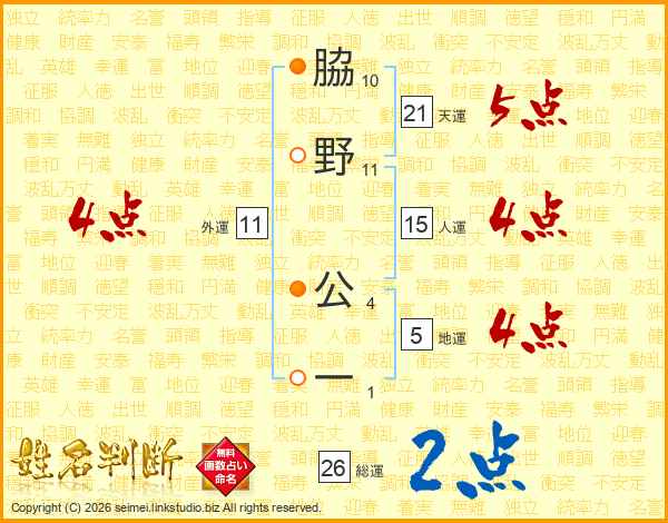 生活面を象徴する運勢です。外部から受ける影響力を表し、結婚運、家庭運や職場、環境への順応性を表します。総運から人運を引いた画数。姓や名が1文字の場合を除く。