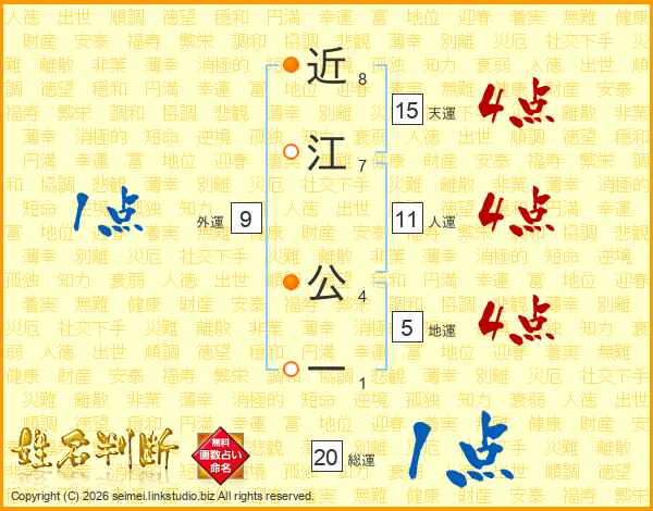 生活面を象徴する運勢です。外部から受ける影響力を表し、結婚運、家庭運や職場、環境への順応性を表します。総運から人運を引いた画数。姓や名が1文字の場合を除く。