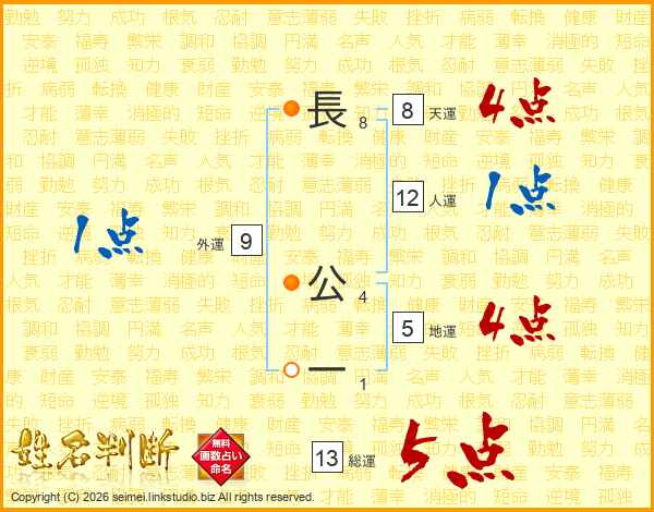 あなたの人生を表す1番重要な運勢です。生涯を通じて影響する総合運となり、主に50歳以降の晩年期に影響を及ぼします。苗字と名前の合計画数。