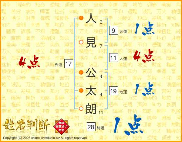 人(2画)見(7画) 公(4画)太(4画)朗(11画)