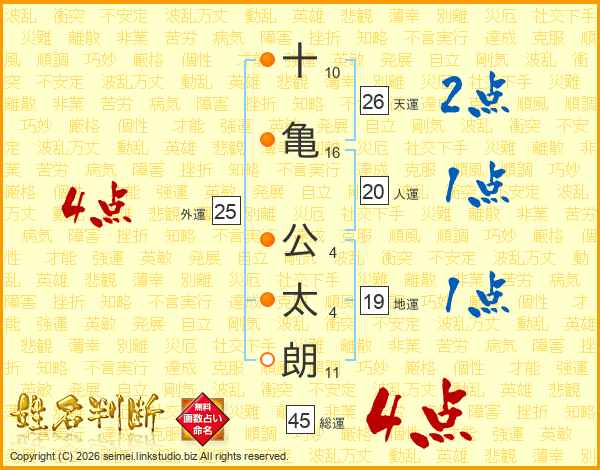 十(10画)亀(16画) 公(4画)太(4画)朗(11画)