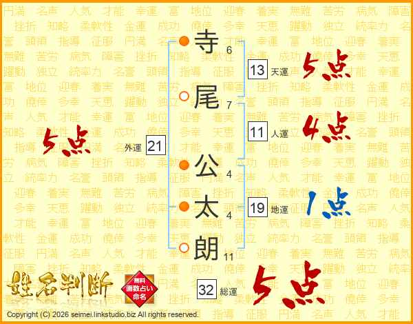 寺(6画)尾(7画) 公(4画)太(4画)朗(11画)