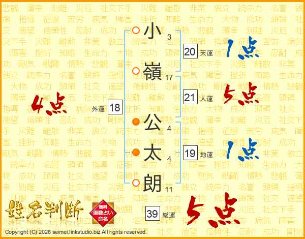 小(3画)嶺(17画) 公(4画)太(4画)朗(11画)