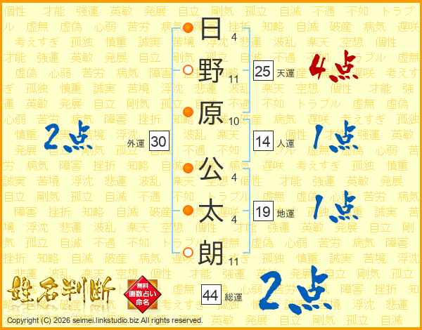 日(4画)野(11画)原(10画) 公(4画)太(4画)朗(11画)