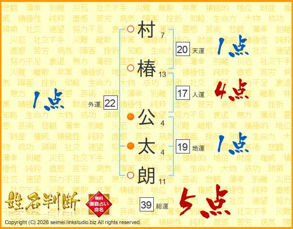 村(7画)椿(13画) 公(4画)太(4画)朗(11画)