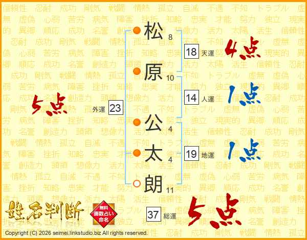 松(8画)原(10画) 公(4画)太(4画)朗(11画)
