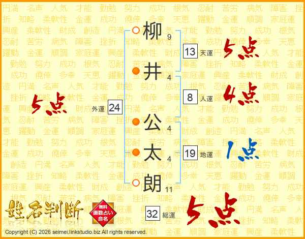 柳井公太朗さんの総運は32画の5点!