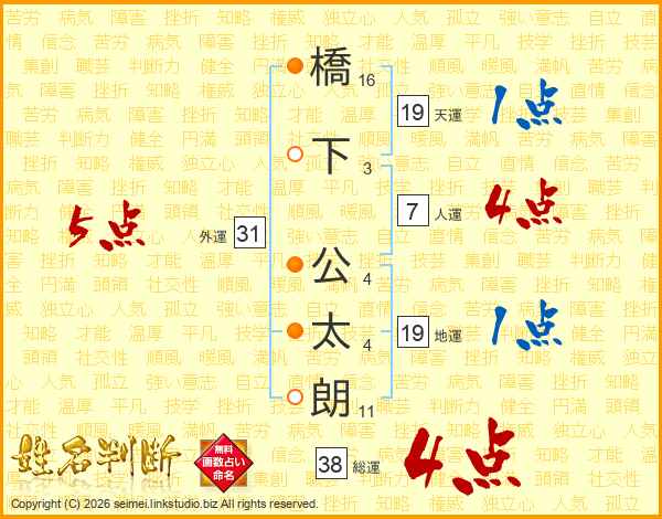 橋下公太朗さんの総運は38画の4点!