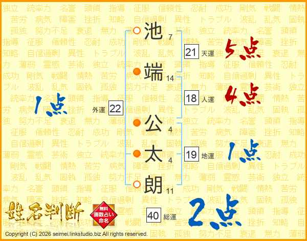 池(7画)端(14画) 公(4画)太(4画)朗(11画)