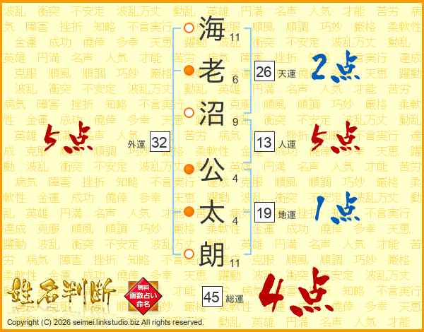 海(11画)老(6画)沼(9画) 公(4画)太(4画)朗(11画)