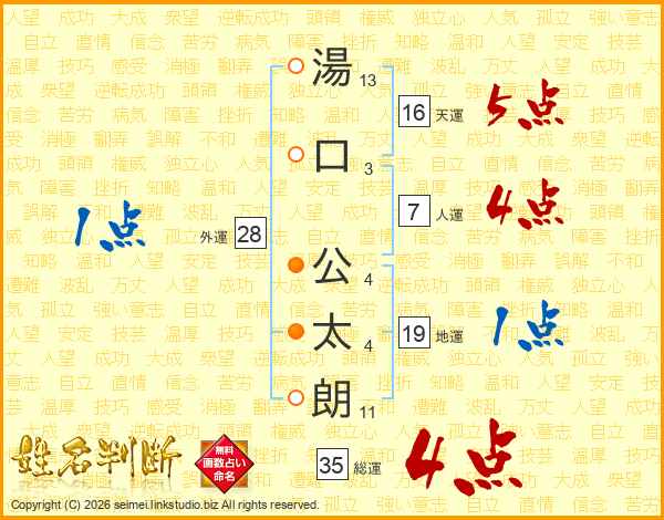 湯(13画)口(3画) 公(4画)太(4画)朗(11画)