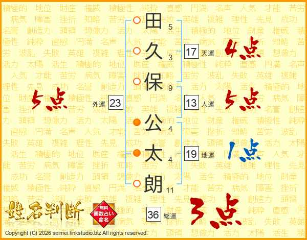 田(5画)久(3画)保(9画) 公(4画)太(4画)朗(11画)