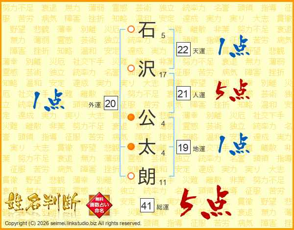 石沢公太朗さんの人運は21画の5点!