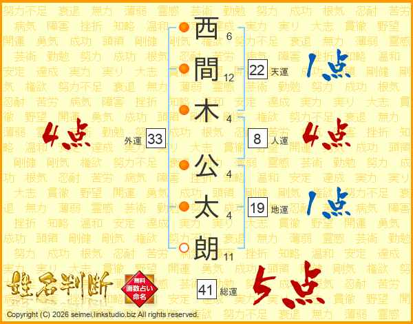 西(6画)間(12画)木(4画) 公(4画)太(4画)朗(11画)
