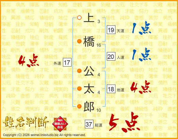 上橋公太郎さんの総運は37画の5点!