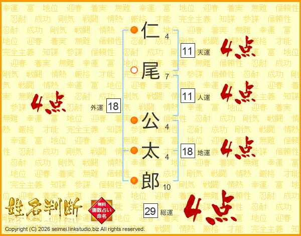 仁(4画)尾(7画) 公(4画)太(4画)郎(10画)