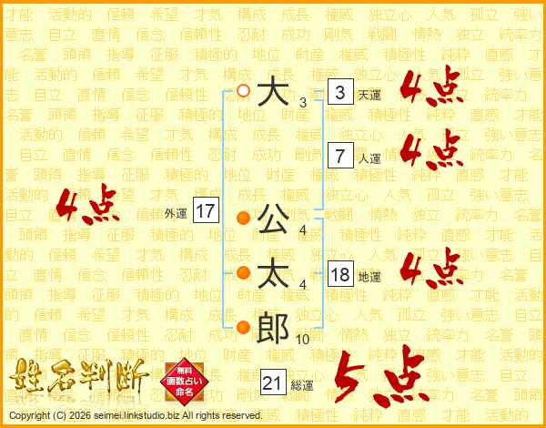 あなたの人生を表す1番重要な運勢です。生涯を通じて影響する総合運となり、主に50歳以降の晩年期に影響を及ぼします。苗字と名前の合計画数。