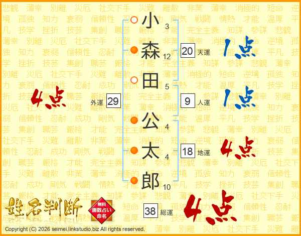 小(3画)森(12画)田(5画) 公(4画)太(4画)郎(10画)