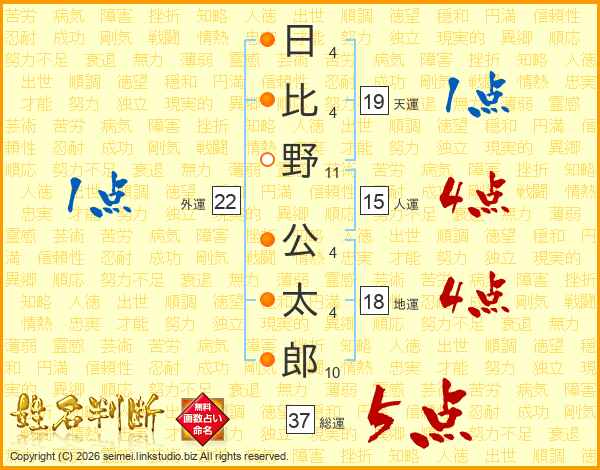 日(4画)比(4画)野(11画) 公(4画)太(4画)郎(10画)