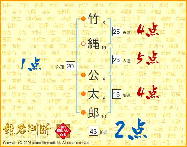 竹(6画)縄(19画) 公(4画)太(4画)郎(10画)