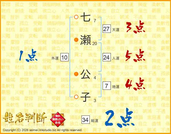 家系が持つ宿命的な運勢を表します。祖先から受け継いだ苗字ですので自分の力が及びません。家柄を象徴します。苗字の合計画数。