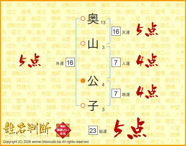 奥(13画)山(3画) 公(4画)子(3画)