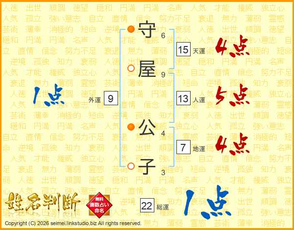 守(6画)屋(9画) 公(4画)子(3画)