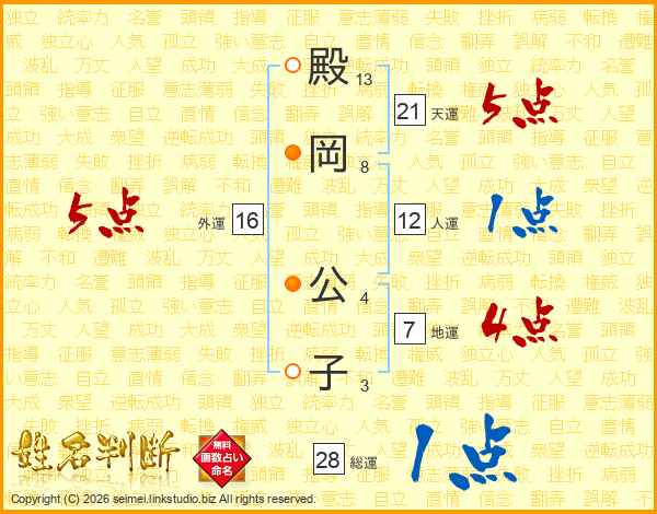 家系が持つ宿命的な運勢を表します。祖先から受け継いだ苗字ですので自分の力が及びません。家柄を象徴します。苗字の合計画数。