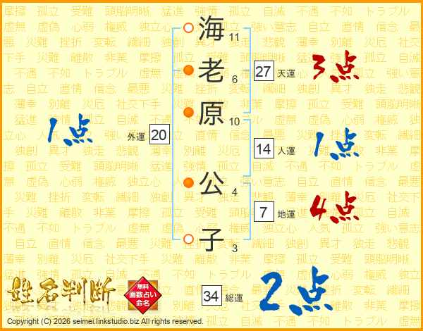 海(11画)老(6画)原(10画) 公(4画)子(3画)