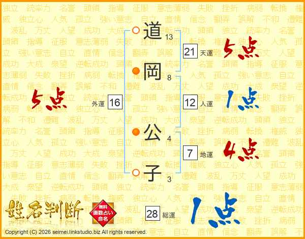 あなたの人生を表す1番重要な運勢です。生涯を通じて影響する総合運となり、主に50歳以降の晩年期に影響を及ぼします。苗字と名前の合計画数。