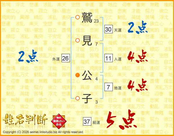 鷲(23画)見(7画) 公(4画)子(3画)