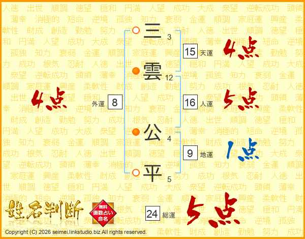 あなたの人生を表す1番重要な運勢です。生涯を通じて影響する総合運となり、主に50歳以降の晩年期に影響を及ぼします。苗字と名前の合計画数。
