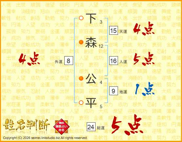 あなたの人生を表す1番重要な運勢です。生涯を通じて影響する総合運となり、主に50歳以降の晩年期に影響を及ぼします。苗字と名前の合計画数。