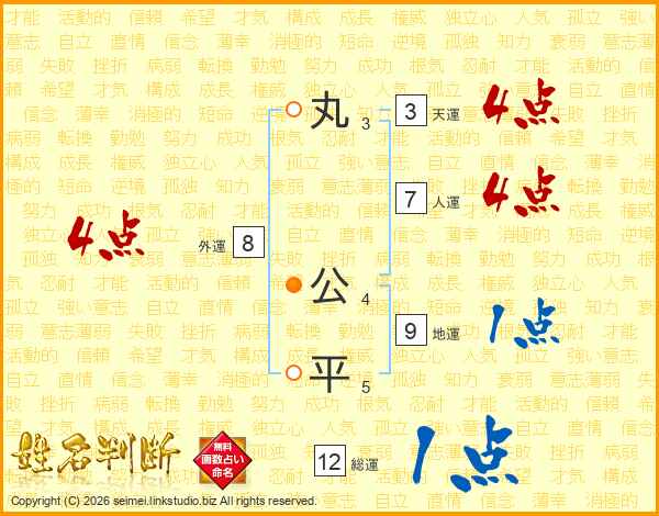 画数の奇数(○陽)と偶数(●陰)の配列で吉凶を占います。どちらかにかたよる名前は大凶名で避ける必要があります。画数の奇数偶数。