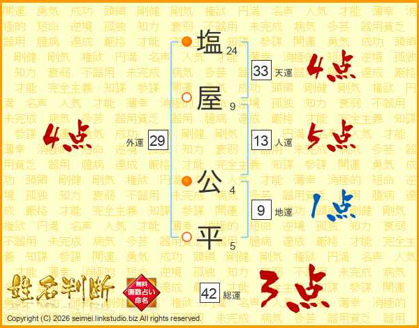 塩(24画)屋(9画) 公(4画)平(5画)