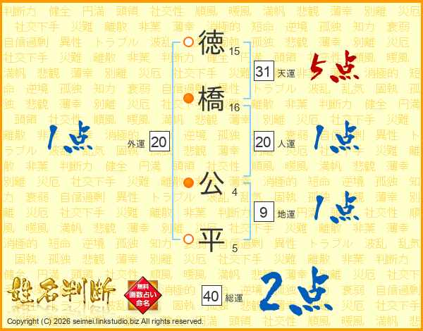 生活面を象徴する運勢です。外部から受ける影響力を表し、結婚運、家庭運や職場、環境への順応性を表します。総運から人運を引いた画数。姓や名が1文字の場合を除く。