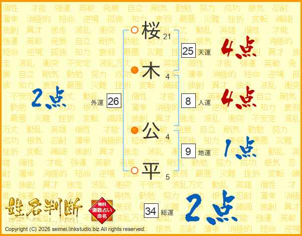あなたの人生を表す1番重要な運勢です。生涯を通じて影響する総合運となり、主に50歳以降の晩年期に影響を及ぼします。苗字と名前の合計画数。