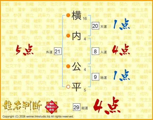 生活面を象徴する運勢です。外部から受ける影響力を表し、結婚運、家庭運や職場、環境への順応性を表します。総運から人運を引いた画数。姓や名が1文字の場合を除く。