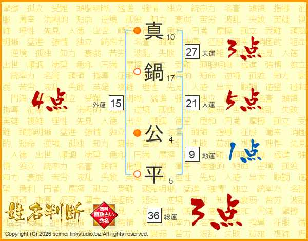 生活面を象徴する運勢です。外部から受ける影響力を表し、結婚運、家庭運や職場、環境への順応性を表します。総運から人運を引いた画数。姓や名が1文字の場合を除く。