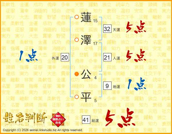 蓮(15画)澤(17画) 公(4画)平(5画)