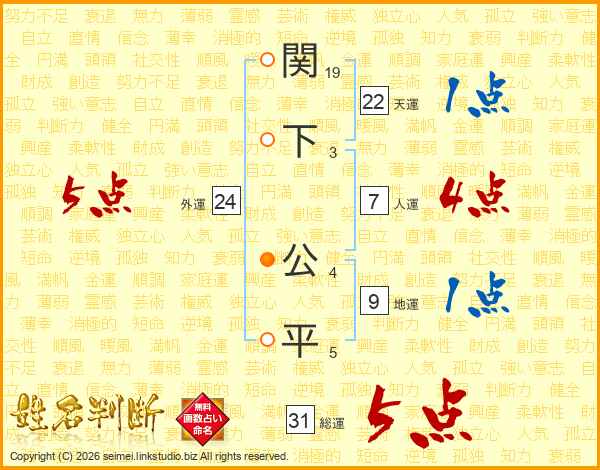 生活面を象徴する運勢です。外部から受ける影響力を表し、結婚運、家庭運や職場、環境への順応性を表します。総運から人運を引いた画数。姓や名が1文字の場合を除く。