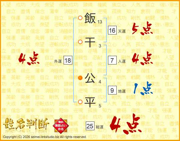 生活面を象徴する運勢です。外部から受ける影響力を表し、結婚運、家庭運や職場、環境への順応性を表します。総運から人運を引いた画数。姓や名が1文字の場合を除く。