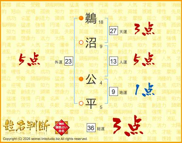 鵜(18画)沼(9画) 公(4画)平(5画)