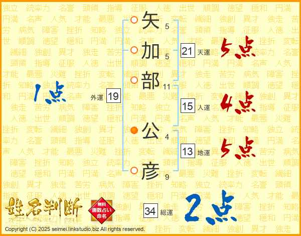 矢加部公彦さんの天運は21画の5点!