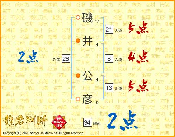 磯(17画)井(4画) 公(4画)彦(9画)