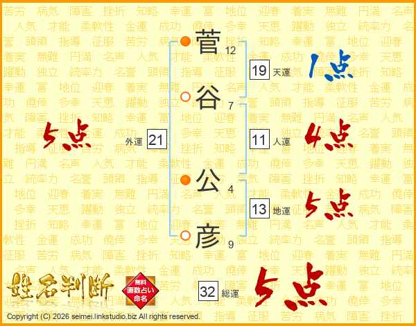 菅(12画)谷(7画) 公(4画)彦(9画)