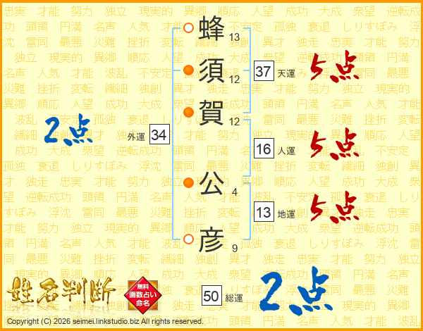 蜂(13画)須(12画)賀(12画) 公(4画)彦(9画)