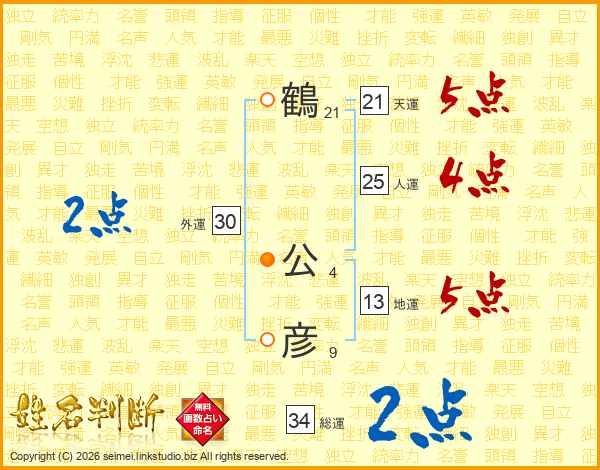 鶴公彦さんの総運は34画の2点!